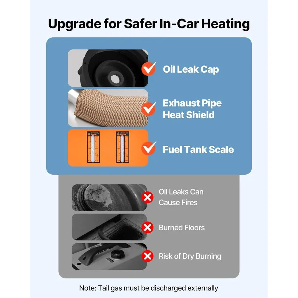 This diesel heater is designed for efficient heating, operating on DC 12V-24V and suitable for spaces from 161 to 215 square feet. It features a ceramic igniter for quick starts in cold weather, providing warmth in vehicles, RVs, boats, decks, patios and more. The heater comes with upgraded security features, including a heat-insulated exhaust pipe shield to prevent burns, a leak-proof fuel cap for safety on rough roads, and a fuel gauge to ensure timely refueling and prevent dry burning. The diesel air heater boasts low fuel consumption, with a precision low-noise fuel pump that consumes only 1 gallon per night (0.18-0.36L/h). Its 5L (1.3gal) large-capacity tank and ≥90% combustion efficiency maximize fuel use and minimize waste. The heater offers dual control options, including a 98ft remote control for preheating from outside the vehicle and an LCD screen for adjusting the temperature between 32-104℉ to suit your needs. The diesel parking heater is effective at altitudes under 9843ft and is compact and easy to install. It provides continuous warmth in high-altitude or cold environments, ensuring comfort wherever you are.