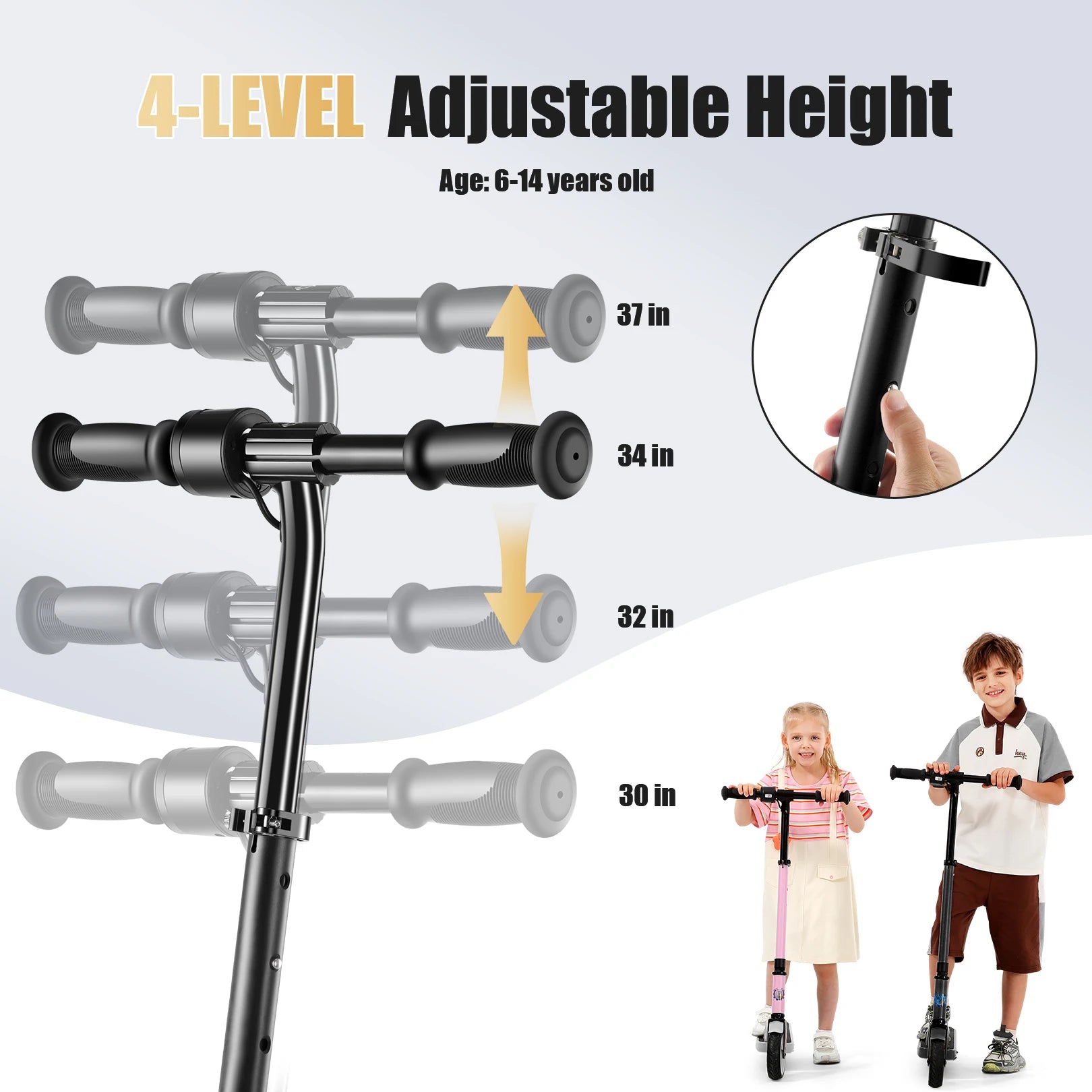 Can Adapt to More Age Groups: The electric scooter for kids is perfect for riders ๐ฒ+ years old, under ๐ญ๐ฏ๐ฎ ๐น๐ฏ๐. (๐ฒ๐ฌ ๐ธ๐ด). There are 4 height options ) to accommodate different ages, the kids electric scooter grows with them. The kids electric scooter adopts a sturdy and durable aluminum alloy frame, can be easily carried by kids with one hand