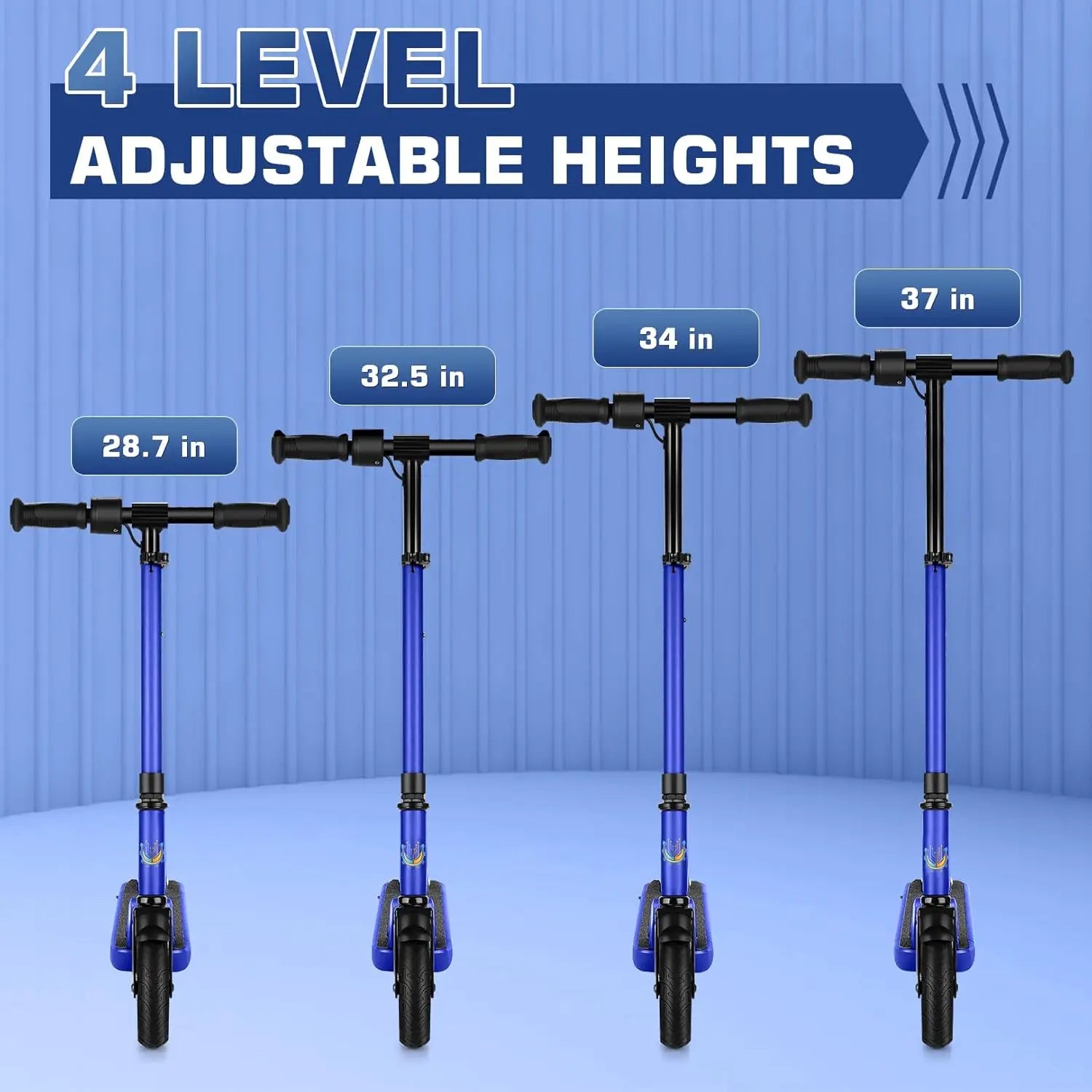 Adjustable and Foldable: The kid's electric scooter ages 8-14 comes with a stem that can be adjusted in three heights to accommodate different heights. In addition, the scooter is lightweight and foldable, making it very easy to carry and store it