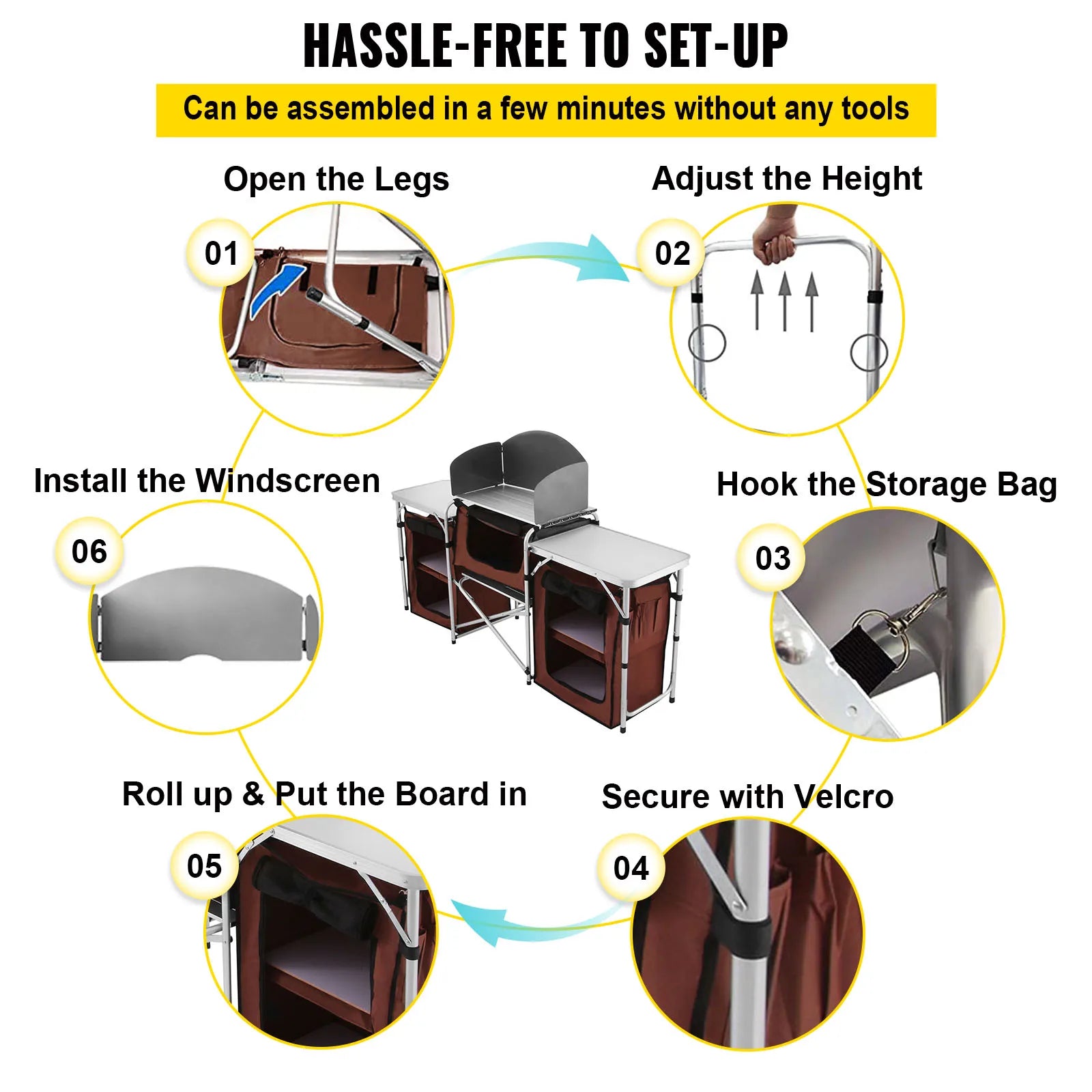 Setup in Seconds: You can easily unfold and pack the portable cook station up, and it can be taken apart in less than several minutes without any tools. The slim-fold table is only 5.5 inches (14 cm) thick, so it won't take up too much space. Everything fits into a single oxford cloth bag, making it easy to take with you wherever you go.